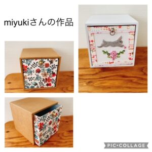 カルトナージュ-ブログ-生徒さんの作品 2024年4月21日 生徒さんの作品641 ☆ 5月レッスンスケジュール ・・・ ★ ★miyukiさんのペン立て&木枠を使った引き出しBOXです♪ お気に入りのリバティ生地で作られました 柄がちがっても リバティで統一されると違う形の作品でもシックリ♡ 木枠を作った引き出しは おうちで可愛いうさぎさんの刺繍入りの引き出しも 復習で作られて(*^^*) 並べるとまたまた可愛い~♡♡♡です♫ ランキングに参加しています♪ バーナーのクリックで応援宜しくお願い致します(*^^*) ↓ にほんブログ村 お教室用のインスタグラム★ my インスタグラム★
