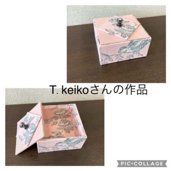 カルトナージュ-ブログ-生徒さんの作品 2024年5月10日 生徒さんの作品653 ☆ 5月レッスンスケジュール ・・・ ★ 手芸のお店 かめしまさんでのレッスンにて T.keikoさんの落とし蓋の箱(正方形)です(*^^*) ランキングに参加しています♪ バーナーのクリックで応援宜しくお願い致します(*^^*) ↓ にほんブログ村 お教室用のインスタグラム★ my インスタグラム★